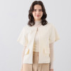 本体に縫い付いたショールの上からでも下からでも腕を通せて2通りの着こなしが楽しめる、個性的な一着。
