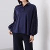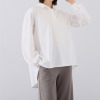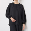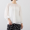 前襟ぐりと袖口のふんわりギャザーが印象的。オフィスからセレモニーまで、幅広く使えます。