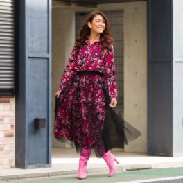 程良い透け感が大人の抜け感を演出するチュール。Tシャツ感覚で着られて、きちんと感のあるスタイルに。