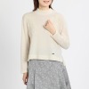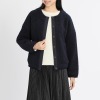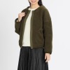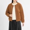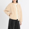 ボア素材をメインに用いた、大人かわいいシルエット。ノーカラーと短めの着丈がデザインのポイント。