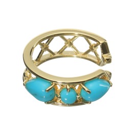 初めは、カーフの間隔が狭くてどうすれば付けられるのか痛くて悩んだものの、耳上部の薄い骨部分から入れれば簡単に着脱出来ることがわかりました。ゴールドとターコイズの色の対比が存在感を出しています。