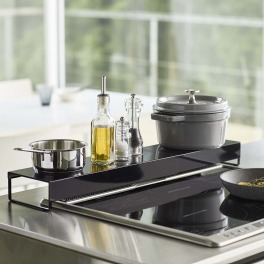 長さが調節できて便利です。これを使ってスッキリスタイリッシュ! オシャレでとても気に入りました。家のコンロはフラットトップではなく、昔ながらの高さがある物なので、後ろ前を逆にして置きました。ぴったりでした。