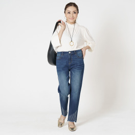 いつも恭子エドワーズさんのブランド商品は楽しみにしていますが、小柄で低身長ちょいポチゃな体型の私には、ボトムスはなかなか合うものが見つからないのですが、今回のデニムも私にはちょっと裾たけは長めにはなりましたが、許容範囲でおさまり、軽くて、柔らかくて、履きやすく、おしゃれで凄く気に入りました。148cmでSサイズ購入しました、恭子さま、たまにでいいですので、低身長でも履ける丈のボトムスもご検討頂けたら嬉しいです。