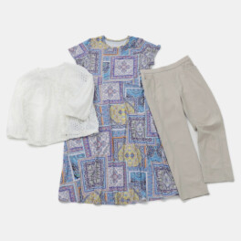 もう一つは、ワンピースにベージュのパンツ、ホワイトのシャツ。