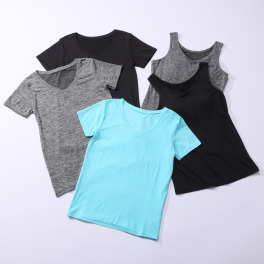 グレー、黒、水色のカップ付きタンクトップと白いタンクトップ、グレーのTシャツでした。