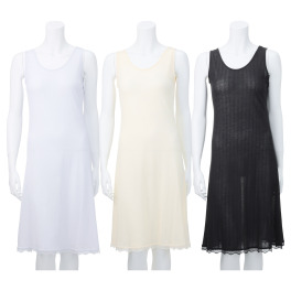 綿100%のスリップをずっとずっと待ってました。酷暑のなか、化学繊維の肌着を身に付けたくなくて、さがしてたのですが、なかなかなく、諦めかけていた時やっと出会いました・ランニングタイプで、肩紐もなく届いた日から毎日着用してます。レース部分がもう少しお洒落だと最高かな。でも大満足でした。