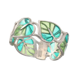 ステンドグラスを思い起こさせるグリーン系とブルー系の葉っぱのモチーフのリングです