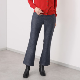 主張しすぎないベルボトムで、脚がスッキリ細見えします。デニムに見えてもカジュアルすぎなくて品よく着られます。