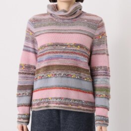 さすがM&KYOKO、いろいろな糸を使って素敵なセーターです。しかし、若い頃から、どうもブラウン系は苦手で似合わない。ブルー系は残りわずかになっていたのですが交換していただきました。
