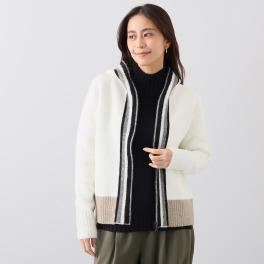 シンプルだけどオシャレな雰囲気で一目惚れし購入。早速旅行に着て行きました。しっかり厚手で、でも重く無く襟なしのダウンコートにこのセーターのフードを出して着るスタイルがとっても素敵でした。またコートのジッパーを開けると、センターの模様が映えて全体にスッキリ見えオシャレでした。今回はブラックでしたがホワイトとグレーも欲しくなりました。