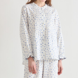 一見似たデザインのミモザイエローとはまた違ったテイストで、落ち着いた清潔感のある清楚なプチローズの柄が素敵です。イエローより小さめのボタンに胸に細かなピンタック(というのかな?)が入っていてさり気ないデザイン性もあり、なにより素材がコットン100で嬉しいし、また着心地もとてもいいです。
