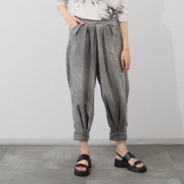 以前の生地のパンツが欲しかったのですが、トップスしか買えませんでした。今回同じパターンのようでしたので早めに買いました。160センチで普段はパンツMですが、緩めの楽ちんパンツで形も良かったですが、光沢のある生地で無い方が良かった。水墨染めのグレーはくすんで見え難しい、トップスもかなり選びます。黒だと普通になるので、着こなし思案中です。形は良かったです。