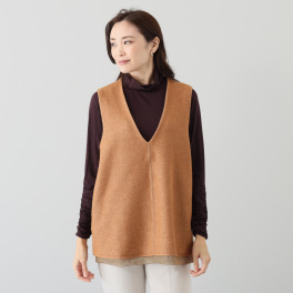 ジレはウールの暖かみを感じる素材で仕上げたチュニック丈が特長