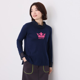 大胆にあしらわれたアイコニックなモティーフがカジュアルな印象ながら、ニットの素材感と襟と袖口のチュールがエレガンスを添えます。