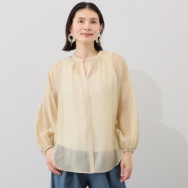 冷房対策にもなる同系色のシャンパンベージュのシアーブラウスを羽織りました。
