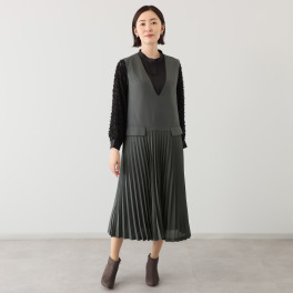 抜け感あるのに華やかなシアーベルスリーブにニットプルオーバーはこれからの季節の相棒に。プリーツジャンパードレスを重ねれば、Vラインがすっきりとした印象を演出し、スーツのようなきちんと感も漂います。アコーディオンプリーツが優美なシルエットを描きます。