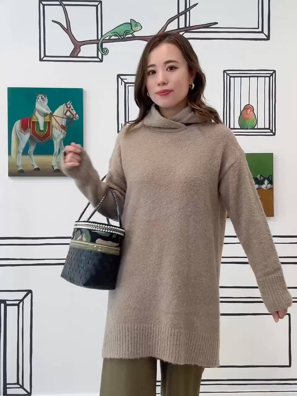 顔まわりにホワイトをもってきてすっきり見えさせつつカーキとブラック合わせの大人綺麗めカジュアルコーデ