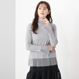 ボディラインにつかず離れずの絶妙なシルエットと、袖口と裾のプリーツチュールのお陰で、一枚でも華やかに、ジャケットインナーとしても収まりが良い使い勝手の良さがあります。