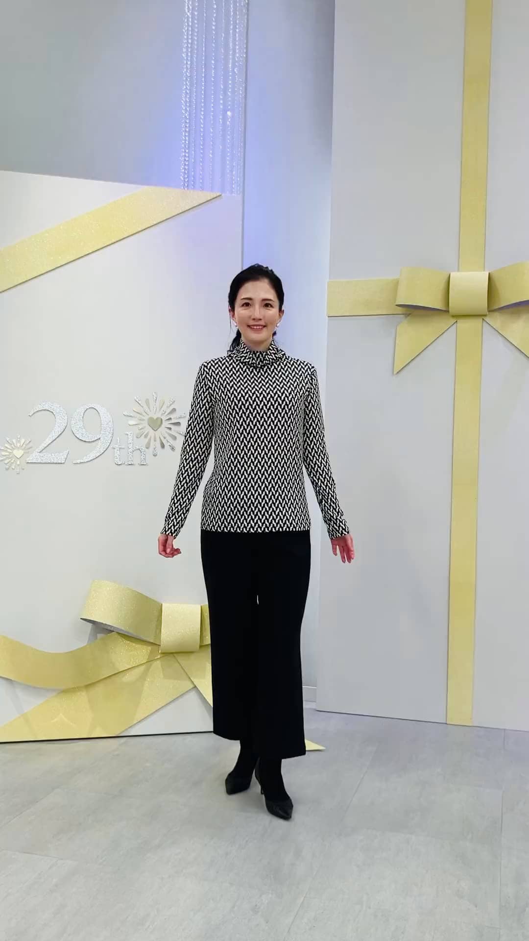 幾何学柄がとても素敵。モノトーンですがとても華やかで、レイヤード使いで襟や袖を出すコーディネートに重宝しそうです。