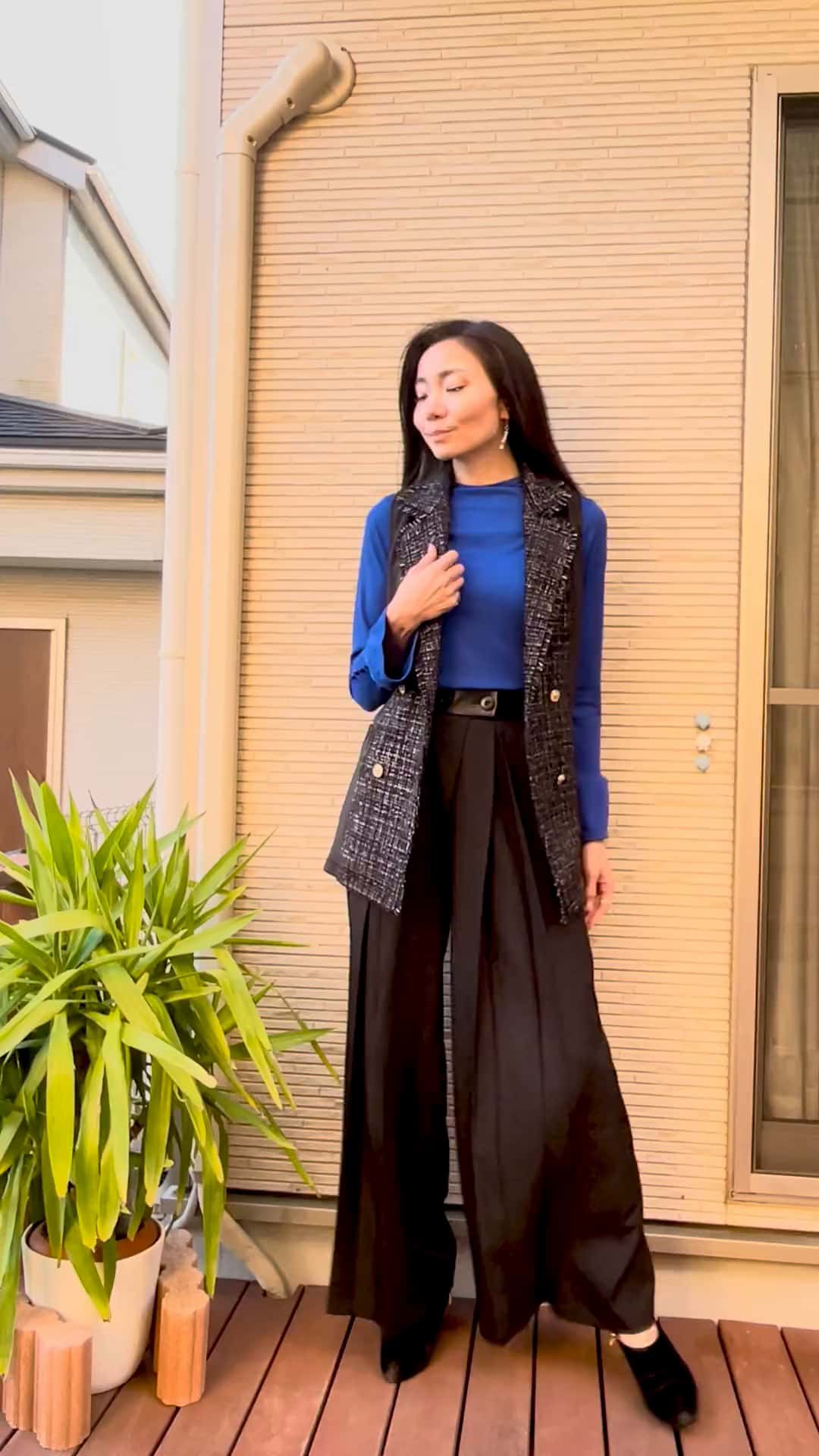 【秋〜初冬に大活躍のツィードジレは榎本マジック炸裂!】秋冬の重ね着は榎本マジックでかしこく重ね着を!正面から見た時に両サイド部分を異素材にして陰影をつけているので、重ね着しても細見え効果抜群!着るだけで自信を纏う、榎本流黄金比が叶う沿岸スタイル「コースタルドライブ」!秋冬のラインナップを12月6日からさらに公開です!着用しているのは、全てMサイズ。・ツィードジレベスト(ブラック)・ベルスリーブオンオフリブトップス(ブルー)※完売・レザーライク使いタックワイドパンツ(ブラック)