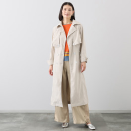 春風を纏うような,軽やかで、ドラマチックな,ロングトレンチコートです。ショートジャケットをレイヤードした様な立体的な浮きヨークが、デザインポイントとなり,トップスをコンパクトに見せ,ウエストから裾に向かって広がるフィット&フレアーがドラマティックです。ウエストベルトを絞めると,コートドレスの様なスタイルも楽しめます。