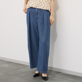 デニムパンツは足首ぐらいの丈で、一見するとカジュアルに見えるけど、タックが入っているから、