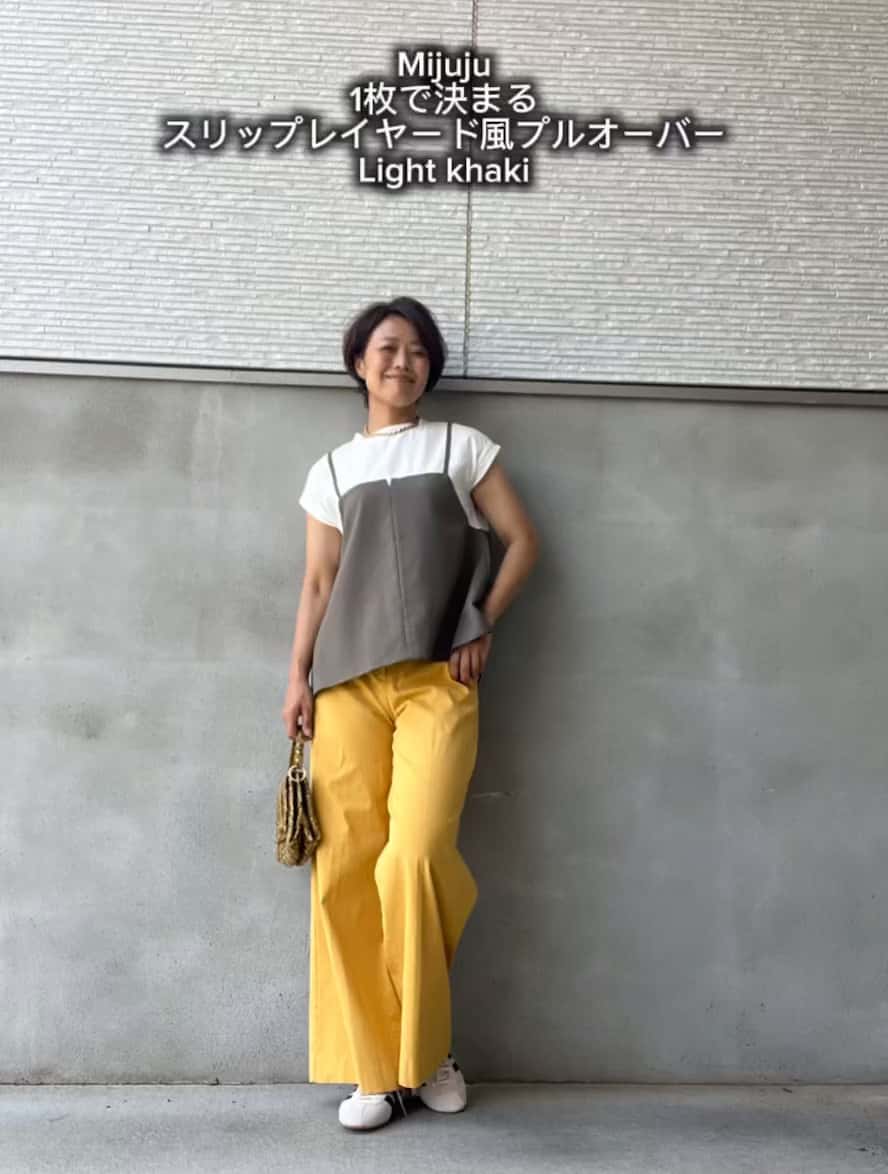 【Tシャツ×キャミのレイヤード風トップス】実は1枚仕立てだから、肩紐ズレなし・露出も気にならない!詰まりすぎない襟とフレンチスリーブが、きちんと見えと二の腕カバーを両立します✨Tシャツ部分は伸びのいいジャージ素材、キャミは風を通すサラッとジョーゼット。肌離れ◎で、暑い日でもストレスフリー🍃カーキはお洒落感と引き締めのバランスがちょうどよくボトムを選ばず着回せて、毎日頼れる1枚です。着用 170cm Lサイズ