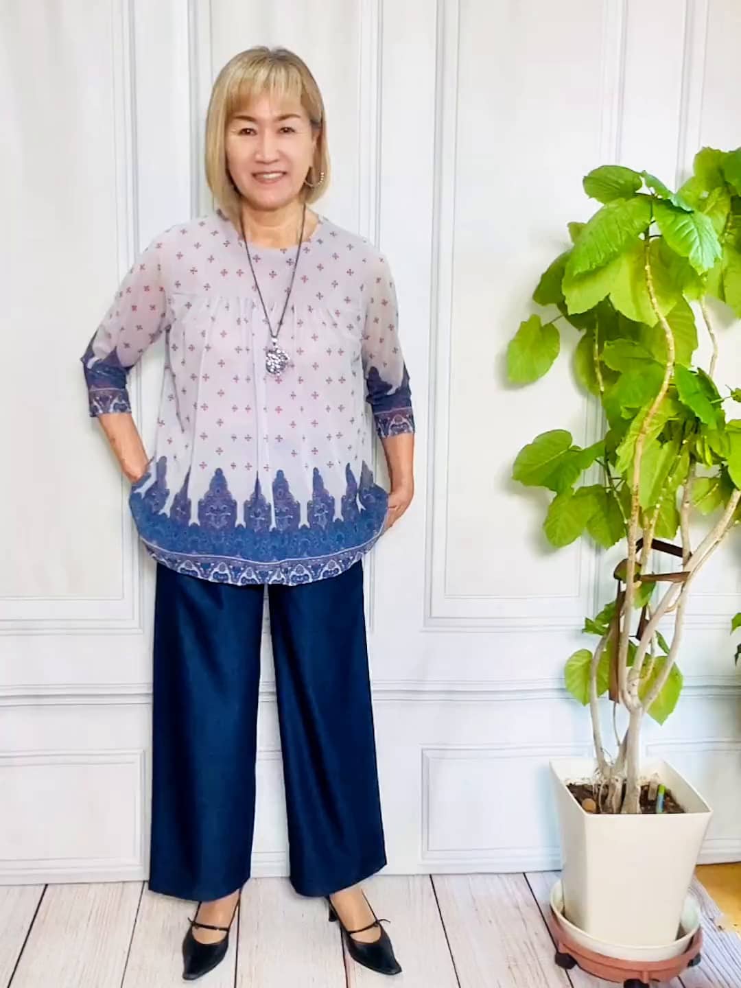 デニム調ワイドパンツ・ネイビーレーヨン混素材でサラッとした肌触り。軽やかで動きやすく、脚のラインを拾わず、一日中はいていても気持ちよく過ごせる心地よさです。シンプルなTシャツから華やかな柄ブラウスまで、トップスを選ばず幅広く合わせられます。同系色のトップスと合わせれば縦長効果ですっきりスタイルに。明るいカラーのトップスを合わせれば軽快な印象になります。プリントバルーンチュニック軽く、スタイルが決まるチュニック。身長160cmMサイズ着用