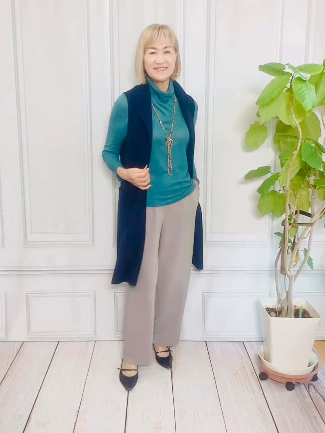 ハイネックインナーとワイドパンツはより直線スタイル。