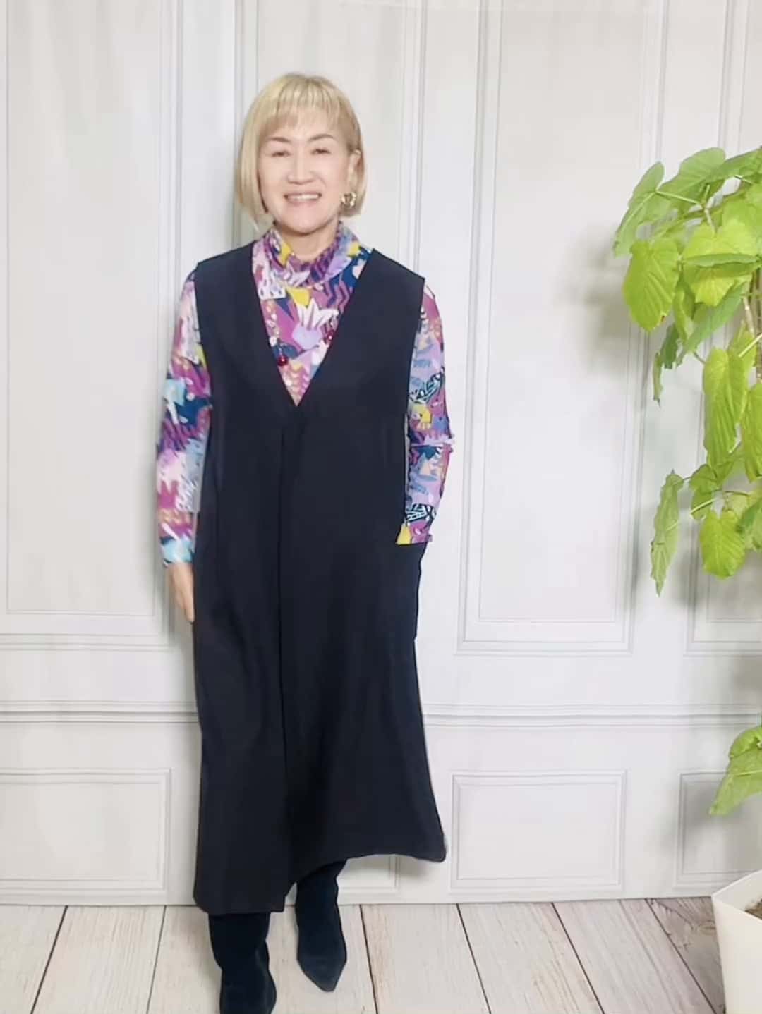 前を開いてパンツアレンジでロングジレスタイル。
