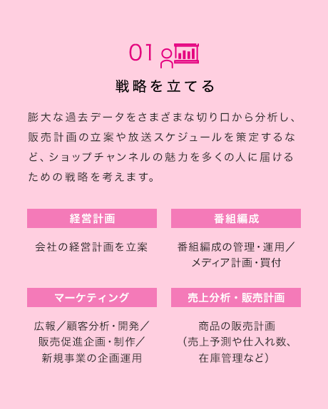 私は昔から買い物が好きで、通販業界を中心に就職活動を行いました。通販業界を志望したのは、私が住んでいた地域ではご高齢の方が多く生活する地域だったので、買い物に行くのが大変だという人にも通販を利用してもっと多くの方に買い物を楽しんでもらいたいと考えたからです。また、PCはなくてもテレビはあるという家庭が多かったので、テレビ通販番組を放送しているショップチャンネルであればよりたくさんの方々に貢献できると思いました。 私が入社して最初に配属されたのは、販売の計画を立てるプランナーでした。いきなり億単位の数字を目にして責任の重大さを感じるとともに、「とりあえずやってみよう」と若手にも任せる風土にも驚いたものです。プランナーとして本日だけのお買い得商品をご紹介する番組「ショップ・スター・バリュー」の計画も任せてもらい、大きなやりがいを感じられました。
