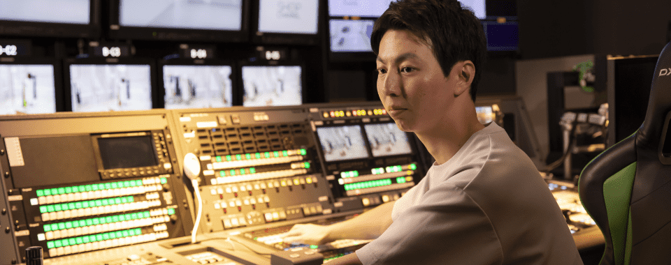 私は2013年に入社後、生放送の進行を確認するフロアーディレクターからスタートし、1年半後に、カメラチームに異動。4年ほどカメラマンとして生放送の撮影に携わった後、次のキャリアステップとして現在の部署に異動しました。生放送で重要な「瞬間の映像をいかに効果的に見せるか」といった基礎スキルは、カメラマン時代に追求し培ってきたこともあり、テクニカルディレクターに求められる画面を瞬時に切り替えるスイッチング技術はスムーズに習得できたと感じています。一方で異動後は、関わるスタッフの人数が格段に増え、よりチームワークを意識して業務に取り組むようになりました。たとえば、撮影現場であるスタジオの運営を行うフロアースタッフから、私が思いつかないような良いアイディアが出た際には、「面白いアイディアだね!」と積極的に取り入れるようにしています。こういうことを重ねることで、番組のクオリティは向上し、現場の雰囲気も良くなるんです。