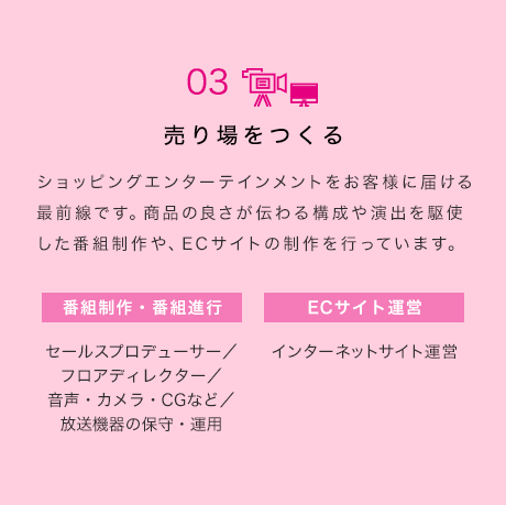 テクニカルディレクターは、生放送の中で、お客さまにお届けする映像を組み立てていく役割を担っています。一般的なテレビ局のテクニカルディレクターとは違い、技術の指揮をしながら、映像の切り替えを担うスイッチャーを兼務もしています。テレビ通販の番組のカット割りは、ドラマや映画の撮影とは異なり、生放送中のトークやセールスの流れに合わせてその場で決めていきます。トークが想定以上に盛り上がった際には商品ではなく、どんな思いで商品開発をしたかであったり、商品の紹介をするために出演している方の表情にフォーカスする、ということも、しばしばあります。テクニカルディレクターの仕事は、「お客さまに商品の魅力が伝わる映像は何か」を探りながら、同時に、商品の作り手や出演者の思い、番組や売り上げを管理するプロデューサーの意図を映像というカタチに組み立てていける面白さがあります。 お客さまに「また見たい!」と思っていただける映像を探求する毎日です。