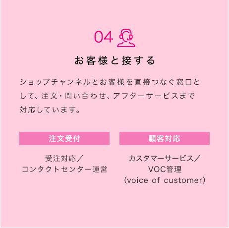 オペレーターの方が、お客さまからのご質問やご要望に、その場で応答できない場合、フォローすることもリーダーの重要な業務です。お客様からの問い合わせ内容は、商品の仕様やキャンペーンの内容、配送、支払方法に関することなどさまざまです。サポートしたオペレーターの方から「伊藤さんの回答内容をお伝えしたところ、お客さまがとても喜んでくださいました!」と言っていただけたときなど、大きな手ごたえを感じます。テレビ通販の場合、お客さまは実際に商品を手にとって確認できないため、たとえば「服の裏地の部分を見せて欲しい」といった放送内容に関するご要望も多く、その際は、スタジオと連携し、リアルタイムで生放送中に反映させることもあります。お客さまから賞賛の声をいただくとやはり嬉しく、また、日々の仕事が番組作りや売上拡大に深く関わっている実感も持っています。