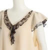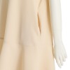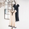 身生地は落ち感の出る肉厚のジョーゼットで、レースは柔らかなナイロンレースを採用。フリル感が出るようにしたパターンで作っており、大人の女性のかわいらしさを演出します。