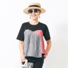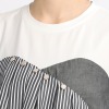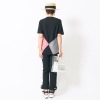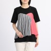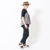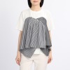 胸元から後ろ身頃にかけて、シワになりにくいストライプ柄の生地と軽やかなシャンブレー素材を組み合わせて、ビスチェ風のデザインに仕上げました。後ろ身頃まで贅沢に生地を用いることで、エレガントなバックスタイルを実現。