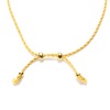 調整用の2つのメタルビーズをそれぞれ両サイドに引っ張ることにより、手首にフィットしてすっきり留めることができます。また、2つのメタルビーズを押さえ、コードの両サイドのファセットビーズをそれぞれ引っ張り、コードが垂れ下がった状態でもお使いいただけます。