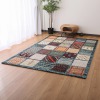 伝統的なギャベ調のモティーフをブロック柄に配したデザイン。8色の色糸をウィルトン織機にて巧みに織り上げて作製しました。洋室、和室ともになじむデザインです。