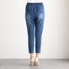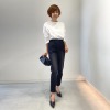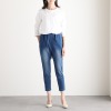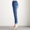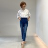 製品洗いをほどこし、前太もも辺りから裾中央に向かってブラスト(ダメージ)加工をほどこすことで、より立体感が生まれ、脚をすっきりと細く見せてくれます。