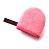毛穴の汚れにアプローチできるよう、ナノフロント(R)糸とポリエステルレギュラー糸を絡ませて立体ループ状にしたナノループ面(ピンクの面)と、ナノフロント(R)糸を編み上げ、お肌により密着するようスエード調に加工し、毛穴やお肌の凹凸に溜まった細かい汚れを落とすナノリッチスエード面(薄いピンクの面)で作製。