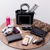 あとひとまわり小さくても良いかなぁと思いましたが、日頃から荷物の多い私にとってはこれくらいで良かったようです。ブラックなのでビジューもキラキラと映えて上品に配列して、収納だけでなく見た目も良くとても使いやすいです。ハンドルが本革というところも助かります。合皮だと使っていくうちに剥がれて汚くなるので、本革にされてところは秀逸だと思います。ビジューが好きなので、今度はモバイルポーチなど小さめのキラキラバッグも作ってください。