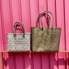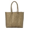 ブラックのLを購入。ペットボトルの蓋を再利用しているところ、かごバッグが欲しかったけれど、天然素材のものは高いし、そうでないものは安っぽい。そういう意味ではほどよい高級感があって良いと思います。雨に強く、自立するところも。ただ、4本に分かれている持ち手がバラバラ別行動してしまうのが難点です。綿テープでも買ってきて2ほんずつまとめてみようかと考えているところです。