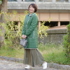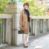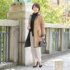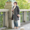 キャメルはもちろん顔も明るく見えて、スッキリと素敵です。ツイードは確かに一見地味に見えましたが、閉めて着るとショールカラーとダブルの小さなボタンと貼り付けポケットがかわいくて、若々しくなる。黒の斜めがけバッグで柄が締まるかな。私は身長153ですが、背の高い人は柄がまたオシャレな感じで着こなせそうに思います。柄でシミついてもわからないし、惜しげなくいっぱい着る予定。どなたか書いていらっしゃったけど、リバーシブルもふつうにいけそう。薄いからどうなのかなと思いましたが、気温9度の日に、ヒートテックシャツとウールセーターで私には十分に暖かかったです。