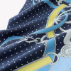 片側は馬具のベルトやさまざまな金具の柄を大胆に描き、ドット柄を配した、ポップでクラシカルなデザインに。