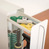 引出しはローラー付きのレールでスムーズに開閉でき、奥の物が取り出しやすく、スプレー缶や日焼け止めなどのボトル類を収納できます。