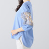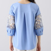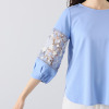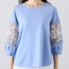 3色の先染め糸を用いた、華やかな刺しゅうレースで切り替えた袖デザインがアクセント!