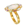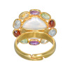 タブレット状の淡水バロックパールを中心にセットし、その周りをオーバルシェイプのガーネット、ブルートパーズ、シトリン、アメシスト、ペリドットで花びらのように取り囲んだ、フラワーモティーフのアジャスタブルリングです。