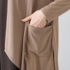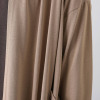 バイアスにカットした動きのあるパターンメイキングで、首回りからフロントへ流れるように落ちる前合わせが美しく、イレギュラーヘムによるたっぷりとしたドレープと相まって、存在感を放ちます。