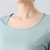 襟元は、胸元に向けて幅を狭くし、すっきりフェイスラインを狙ったスクエアネックライン。
