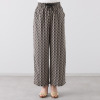 幾何学柄プリントをほどこした、天然素材のような肌触りが特徴の、ポリエステル100%の布帛素材を使用。